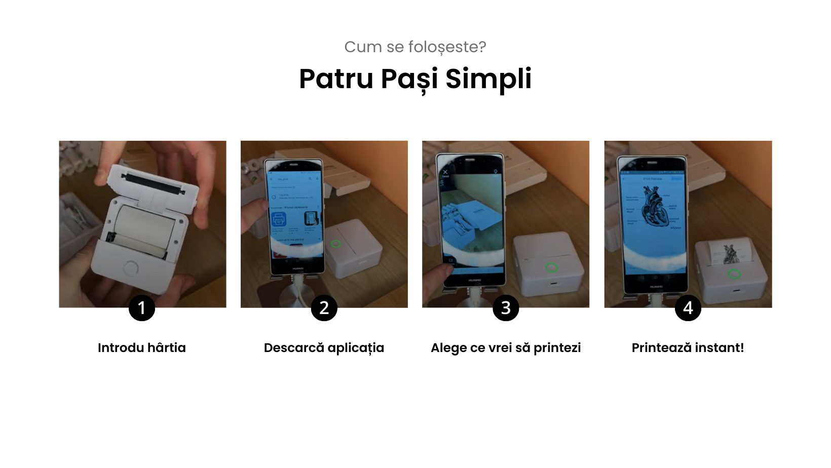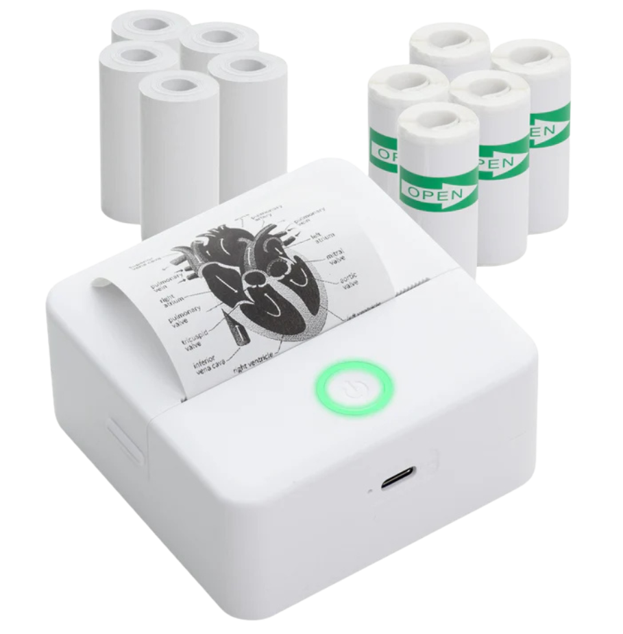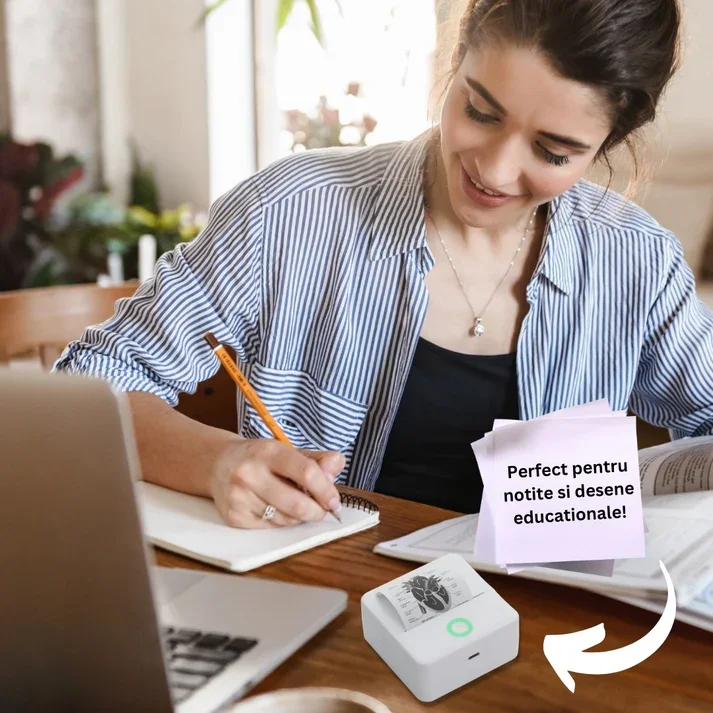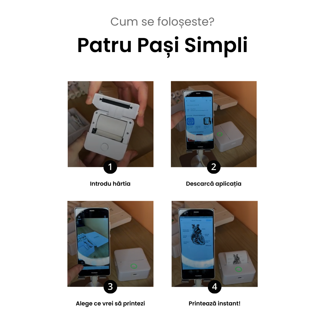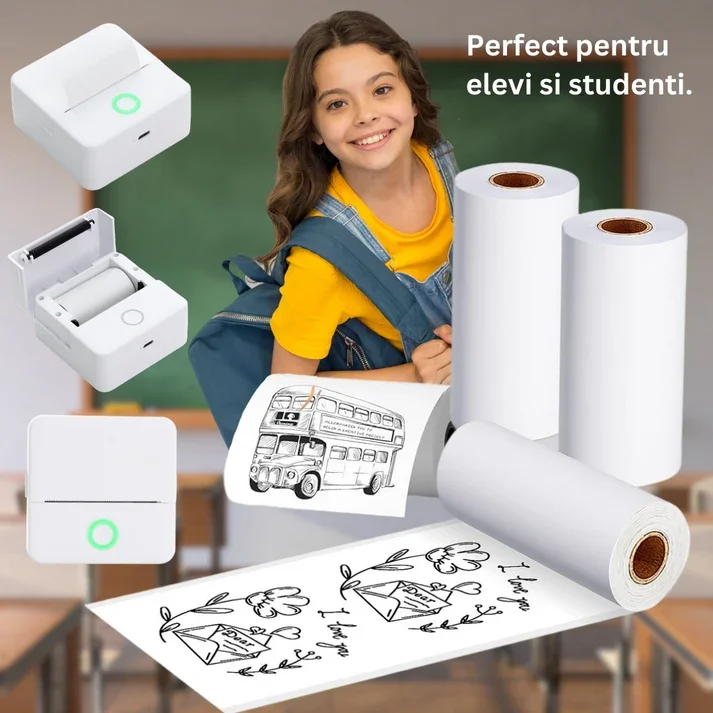 Imprimanta folosește tehnologie termică, ceea ce înseamnă că nu ai nevoie de cerneală sau toner. Tot ce trebuie să faci este să o conectezi prin Bluetooth la telefonul tău și să printezi direct din aplicația dedicată.